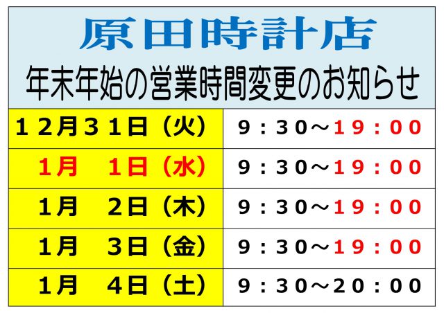 2019-20年 年末年始営業時間の変更をお知らせします。